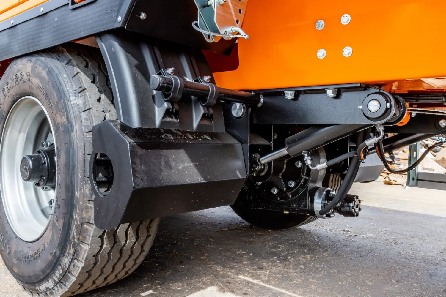 - lowerable rear discharge conveyor for minimum set-up time and perfect maitenance friendliness and accessibility to flail drum, tools and rear basket